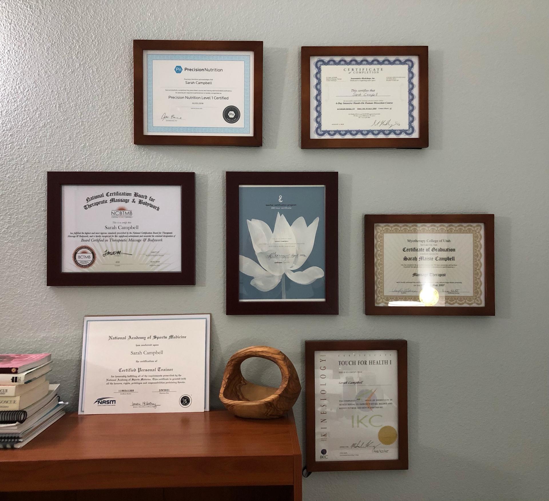 I have certifications and licenses in massage therapy, yoga, personal training, clinical aromatherapy, dog training, and nutrition. I have taken in-depth continuing education in corrective exercise, behavior change psychology, communication, nutrition coaching, and advanced anatomical studies.